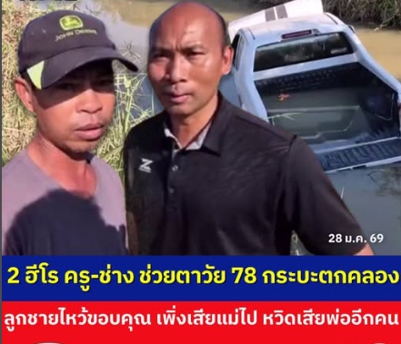 2 ฮีโร! ครู-ช่าง โดดช่วยตาวัย 78 กระบะตกคลอง ลูกชายไหว้ขอบคุณทั้งน้ำตา